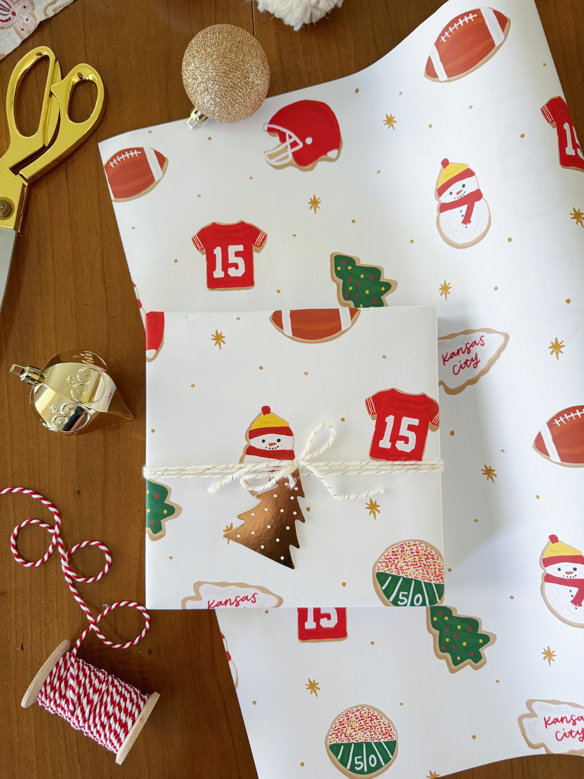 Celebrate the season with a unique twist on traditional wrapping paper! This exclusive Kansas City Football-Inspired Sugar Cookie & Christmas Cookie Wrapping Paper is designed for the ultimate fan. Featuring a fun blend of festive holiday cookies and iconic Kansas City football flair, this wrapping paper will bring extra joy to your gifts