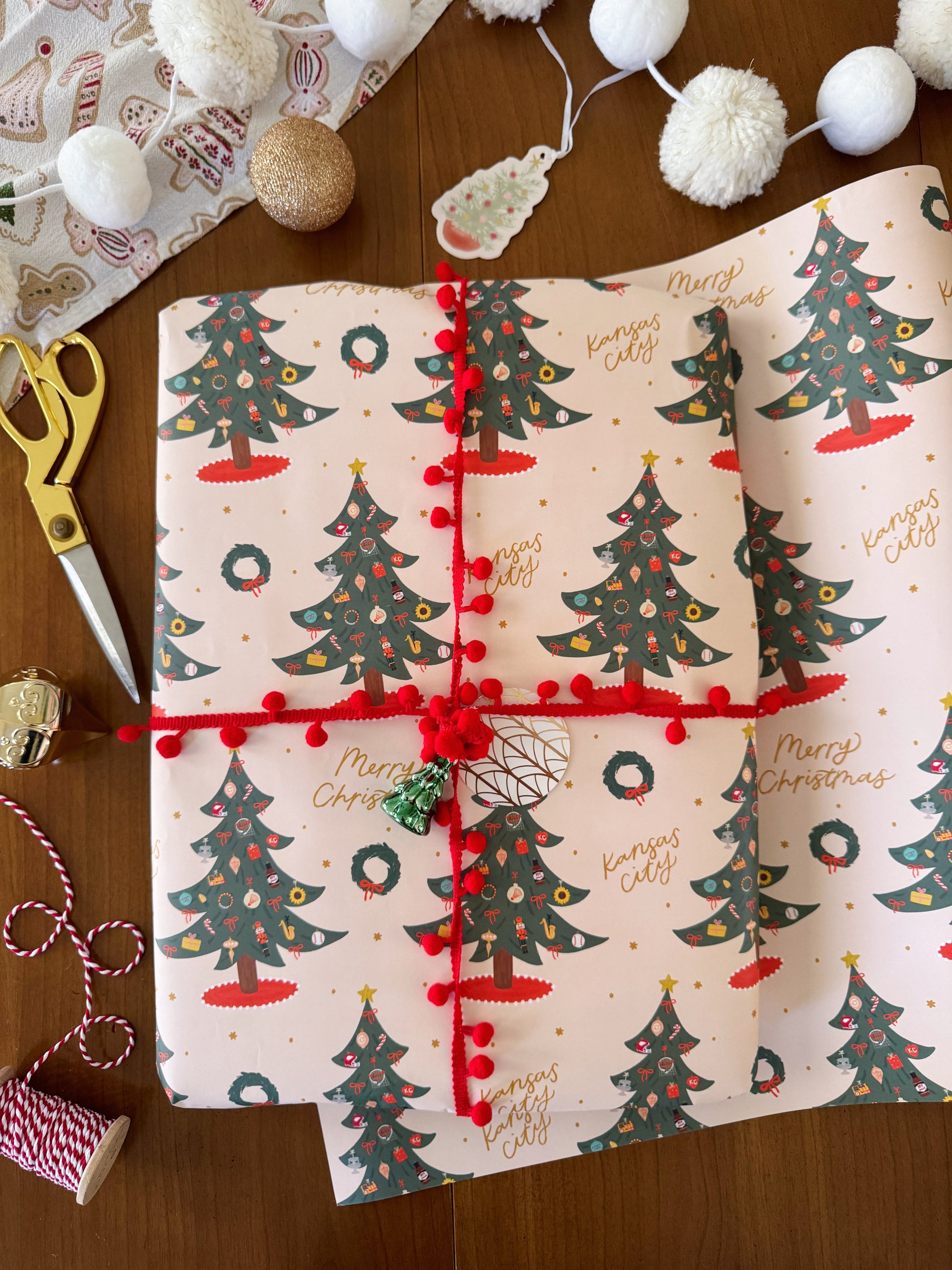 Bring the heart of Kansas City to your holiday season with my beautifully designed wrapping paper. This festive wrapping paper features a unique pattern of Christmas trees adorned with ornaments showcasing the city's most iconic emblems and landmarks. From the Kansas City skyline to beloved local symbols, this wrapping paper adds a personal and hometown touch to your holiday gifts