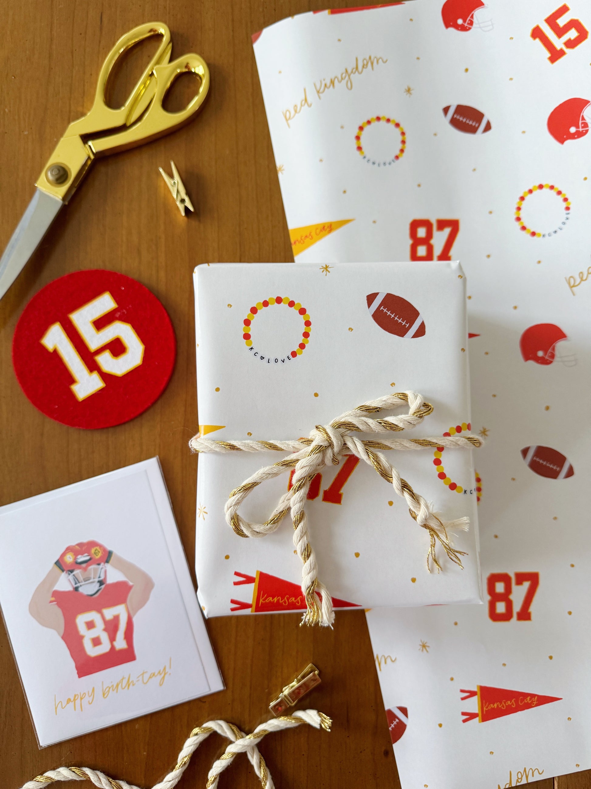 The cutest wrapping paper for your favorite kansas city football lover with iconic "15" and "87" to celebrate our champions. Perfect for birthdays, holidays, game day celebrations, and special occasions, this high-quality paper is a must-have for any KC football fan. This paper goes perfectly with my Travis, Patrick and KC Mascot Birthday Cards as well!